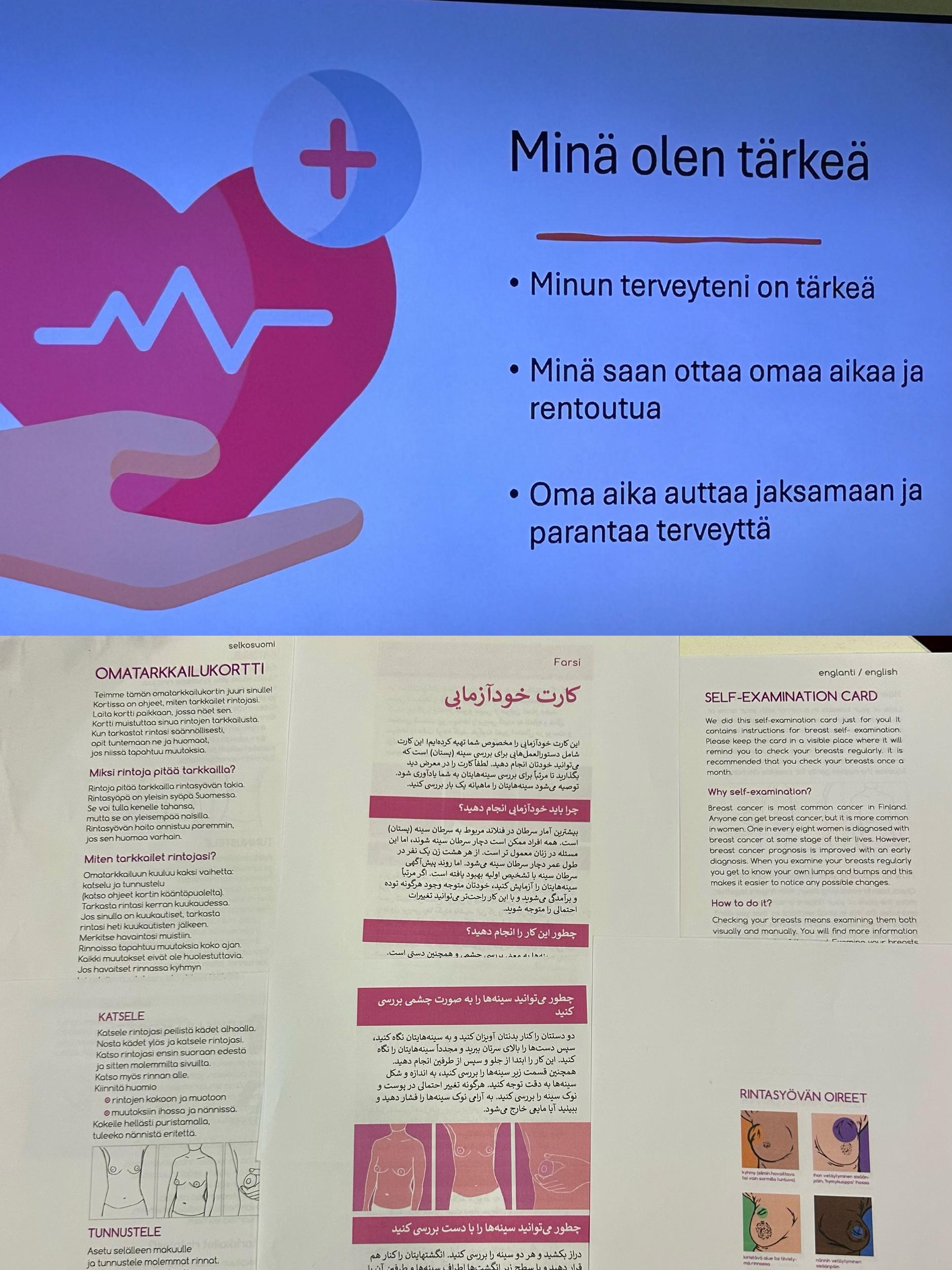 In Vuosaari, the session was about women’s health. We learned about breast self-examination and why it is important to know our own body. The session was very useful, practical and meaningful for all participants.