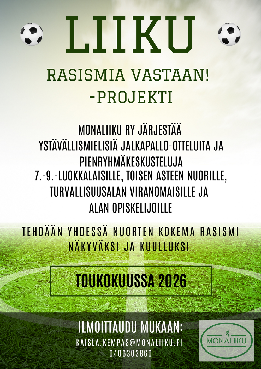 The "Liiku Rasismia Vastaan" project (Move Against Racism), funded by the Finnish Government (Prime Minister's Office / VNK), promotes trust between 13–16-year-old young people and security sector authorities, and reduces racism and polarization through sports and facilitated dialogue.