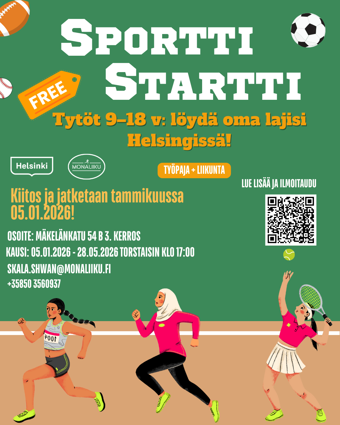 SporttiStartti on maksuton liikunta- ja hyvinvointihanke 9–18-vuotiaille maahanmuuttajataustaisille tytöille Helsingissä. Toiminta sisältää monipuolisia liikuntakäyntejä ja työpajoja, joissa tutustutaan erilaisiin lajeihin, vahvistetaan itseluottamusta ja saadaan uusia kavereita!