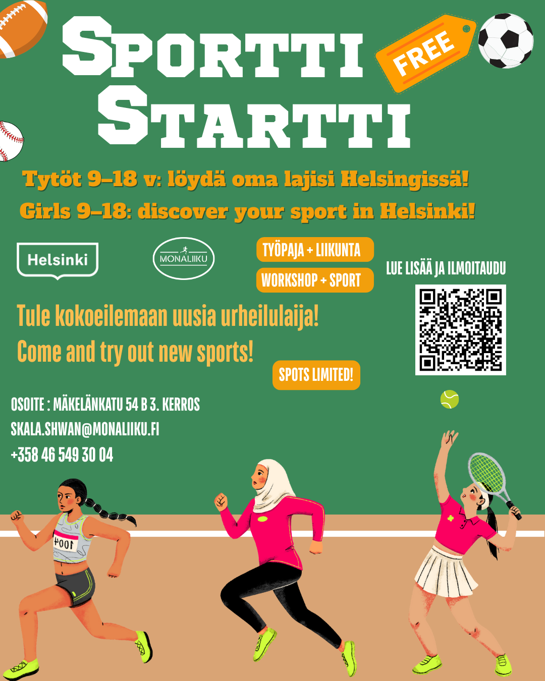 SporttiStartti on maksuton liikunta- ja hyvinvointihanke 9–18-vuotiaille maahanmuuttajataustaisille tytöille Helsingissä. Toiminta sisältää monipuolisia liikuntakäyntejä ja työpajoja, joissa tutustutaan erilaisiin lajeihin, vahvistetaan itseluottamusta ja saadaan uusia kavereita!