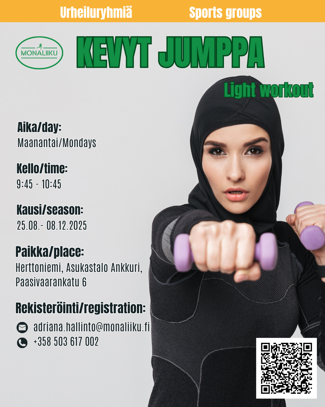 Aloittelijoille, jotka haluavat kevyellä liikunnalla parantaa fyysistä kuntoaan. Tunti sisältää harjoituksia koko keholle. Tunnin aikana liikutaan myös musiikin tahdissa. Tunnilla tavoitellaan pientä hikeä ja hyvää mieltä, tule ja ota mukaan urheiluvaatteet ja juomapullo.