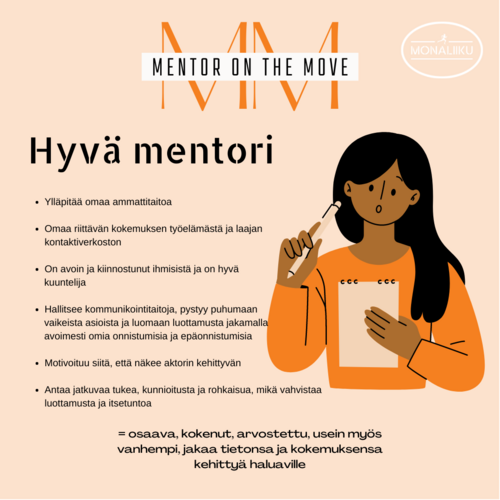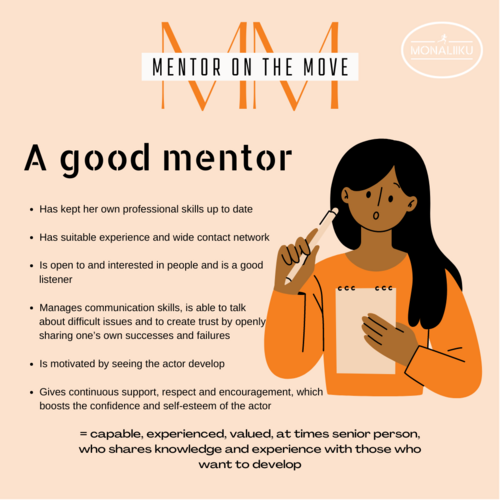 A mentor is a woman who is either a Finn or a woman who has lived in Finland for a considerable time.