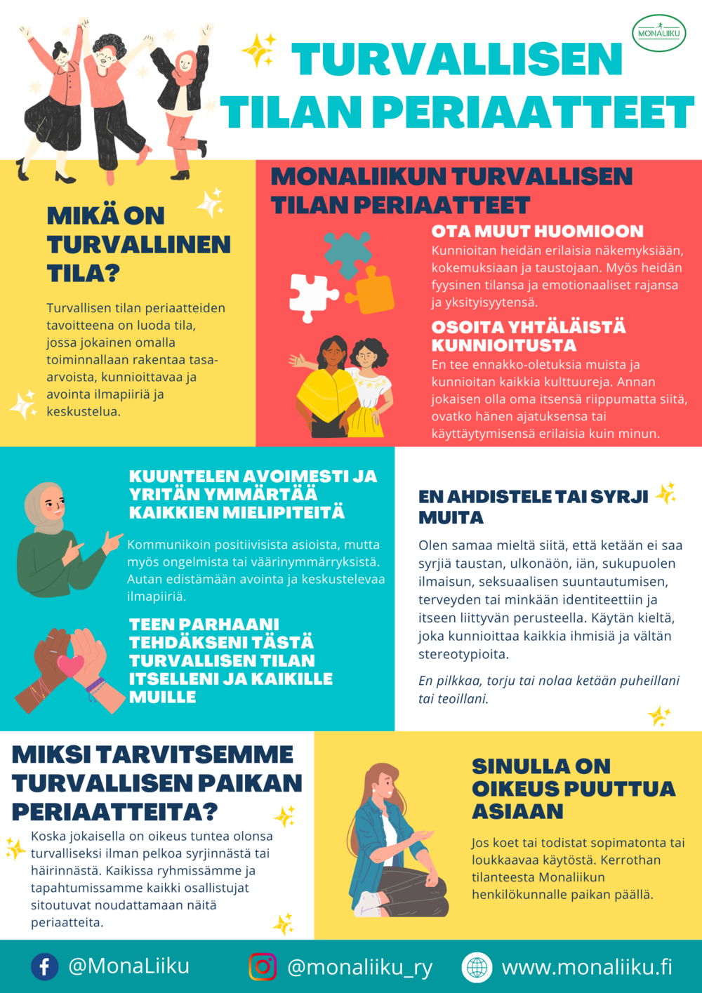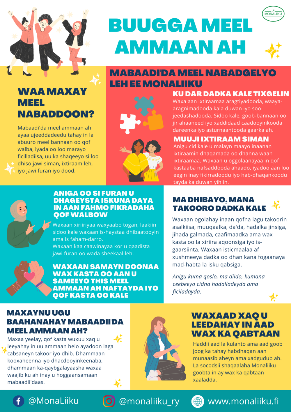 Monaliikun turvallisen tilan periaatteet löytyvät somaliksi, suomeksi, englanniksi ja arabiaksi.